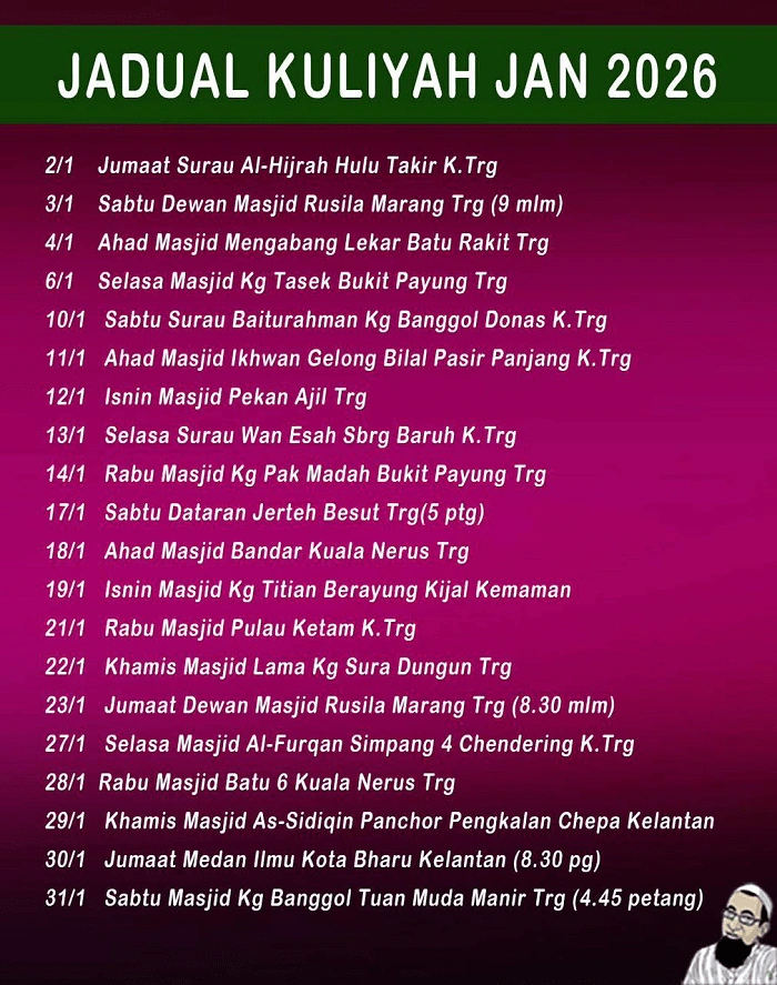 Diantara lokasi ceramah beliau untuk bulan Januari tahun 2026 kali ini diadakan di Kelantan dan Negeri Terengganu.