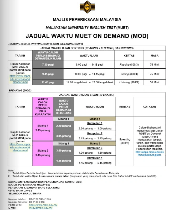 Jadual Waktu Rasmi MUET On Demand (MoD) 2026