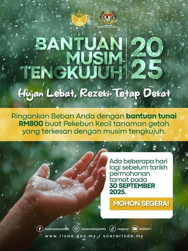 Permohonan Bantuan Musim Tengkujuh Tahun 2025 (BMT2025) telah dibuka mulai 𝟭 𝗝𝗨𝗡 𝟮𝟬𝟮𝟱 𝗵𝗶𝗻𝗴𝗴𝗮 𝟯𝟬 𝗦𝗘𝗣𝗧𝗘𝗠𝗕𝗘𝗥 𝟮𝟬𝟮𝟱 kepada semua Pekebun Kecil dan Penoreh Getah yang layak.