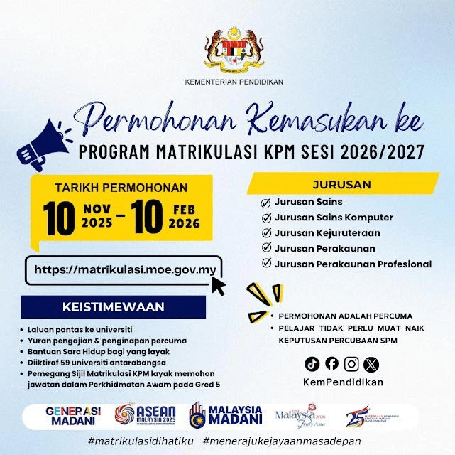 Untuk makluman, permohonan untuk sesi 2026/ 2027 akan dibuka pada 10 November 2025 sehingga 10 Februari 2026. Permohonan boleh di buat secara online melalui Portal Matrikulasi KPM.