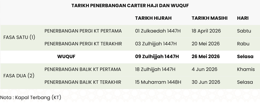 - PENERBANGAN PERGI KT TERAKHIR : 03 Zulhijjah 1447H, 20 Mei 2026, Hari Rabu