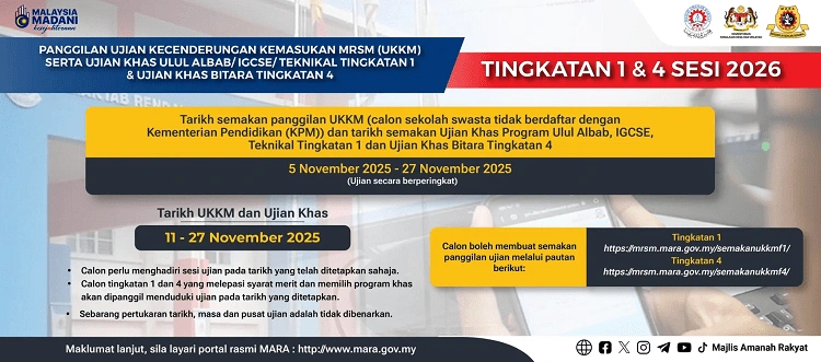 Semakan tarikh UKKM/ Ujian Khas secara atas talian akan mula dibuka pada jam 3.00 petang 5 November 2025 hingga 27 November 2025