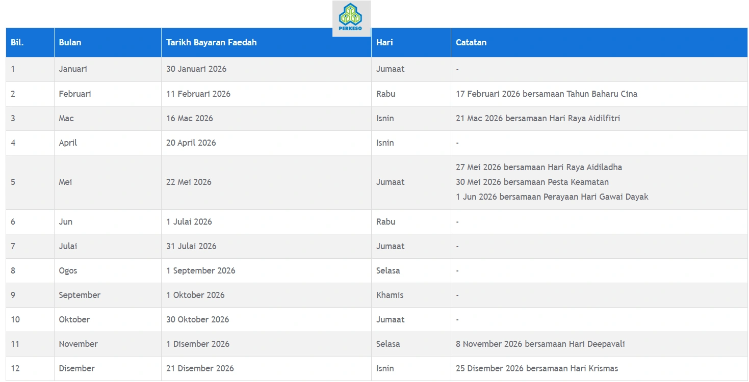 Jadual Tarikh Pembayaran Faedah Bulanan PERKESO Tahun 2026